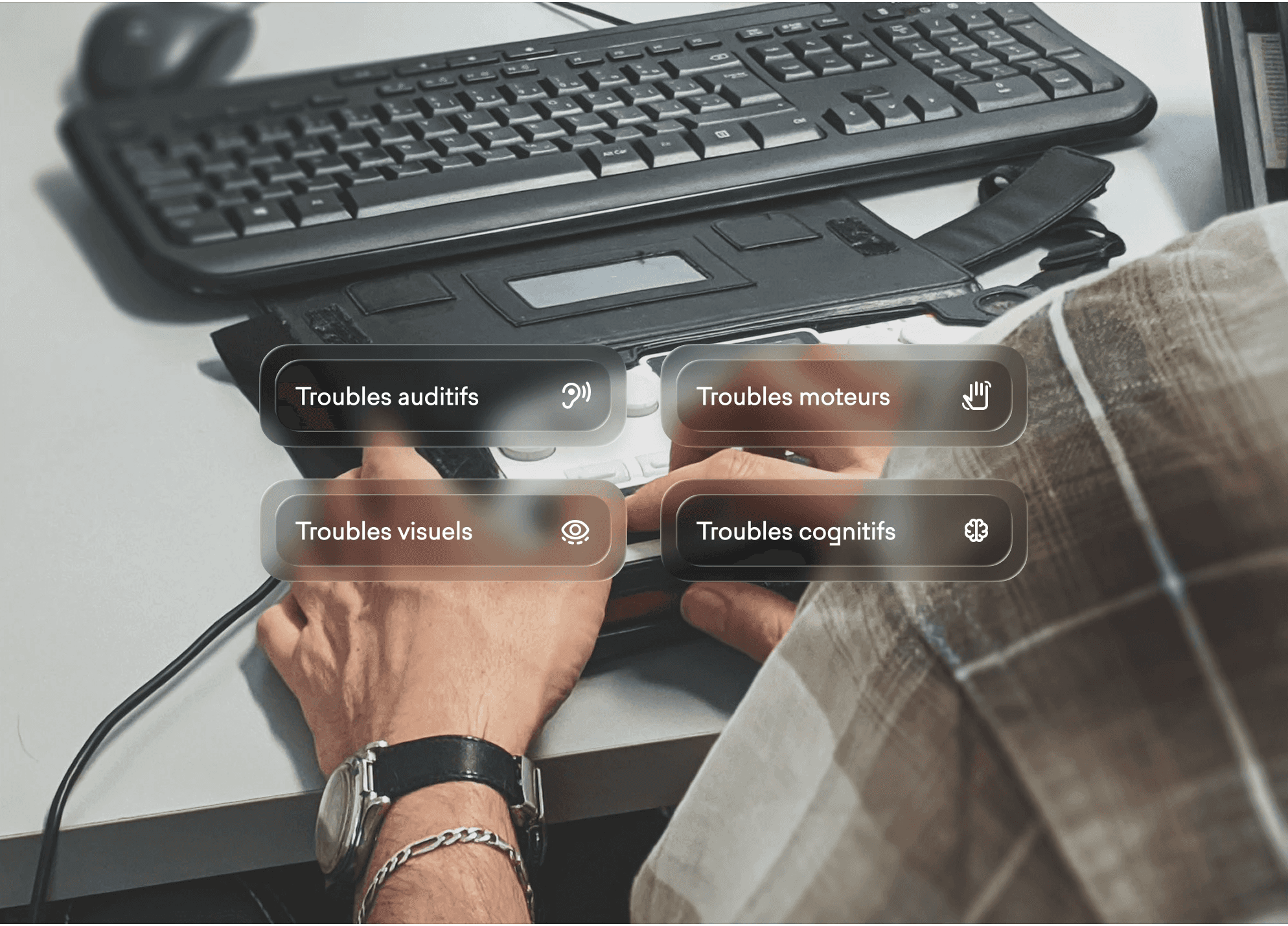 Julien utilise un joystick et des commandes adaptées pour naviguer. Il a besoin d’interfaces accessibles au clavier et sans contraintes de temps.